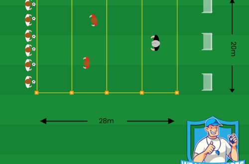 Download print PDF Legenda ? Opbouwend overtal O18 5 – 8 spelers 1/4 veld Spelbeschrijving Ieder team heeft zich opgesteld naast het doel (team rood aan de ene kant en team wit aan de andere kant). Als eerste start team wit met een dribbel naar het doel en probeert daar zonder verdediger te scoren op het doel met de keeper.…