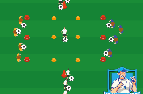 Download print PDF Legenda ? Dribbel en pass O18 12 – 16 spelers 1/2 veld Spelbeschrijving Opstarten – Afbeelding 1 Er staan vier groepen opgesteld bij de rode gronddop zoals afgebeeld op afbeelding 1: Er staat één speler bij de gele gronddop, één speler achter de rode gronddop zonder bal en één speler met bal voor de rode gronddop. De…