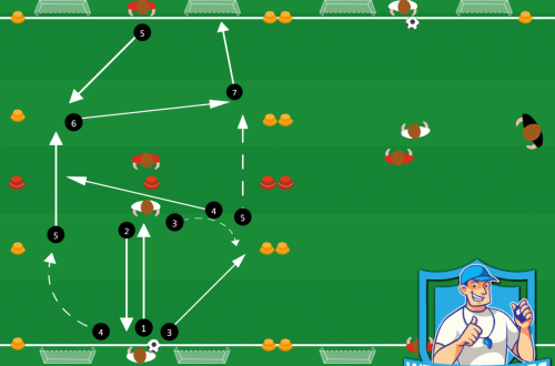 Download print PDF In beweging overspelen + scoren Onder 10 9 tot 12 spelers Hele veld Spelbeschrijving Er worden drie gelijke rijen gemaakt. De speler in het midden begint met de bal en speelt de bal naar een medespeler links of rechts. Alle spelers blijven in dezelfde baan rennen terwijl ze naar elkaar overspelen. De eerste speler welke de kans…