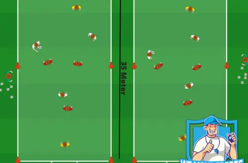Download print PDF 2 tegen 4 druk geven op de bal O14 10 – 12 spelers 1/4 veld Spelbeschrijving Bij dit spel zijn er twee vakken (een klein vak met daarin 4 witte aanvallers & 2 rode verdedigers en een groot vak met daarin 4 rode spelers). De witte aanvallers proberen in het vak rond te spelen. De verdedigers proberen…