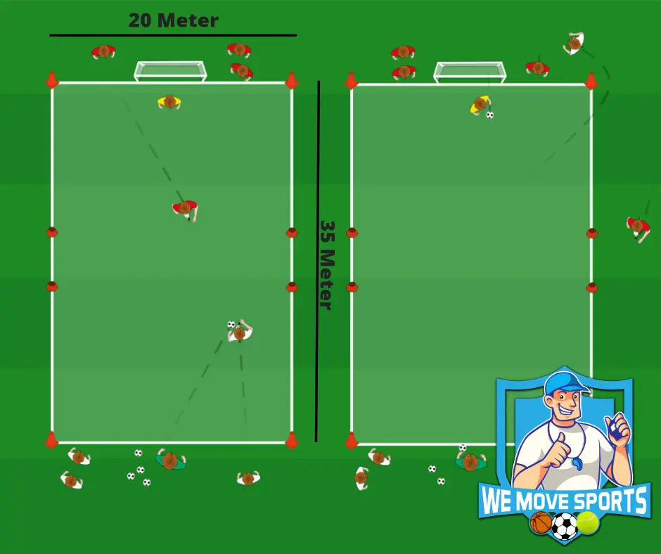 Er starten twee rijen naast de trainer en twee rijen naast het doel. De trainer gooit de bal links of rechts voor zich uit. De aanvallende speler die het dichste bij is loopt in en brengt de bal onder controleren. De verdediger welke schuin tegenover de aanvaller naast het doel staat probeert een score te voorkomen. De aanvaller verdient een punt wanneer er gescoord wordt, de verdediger kan een punt scoren wanneer zij de bal veroveren.