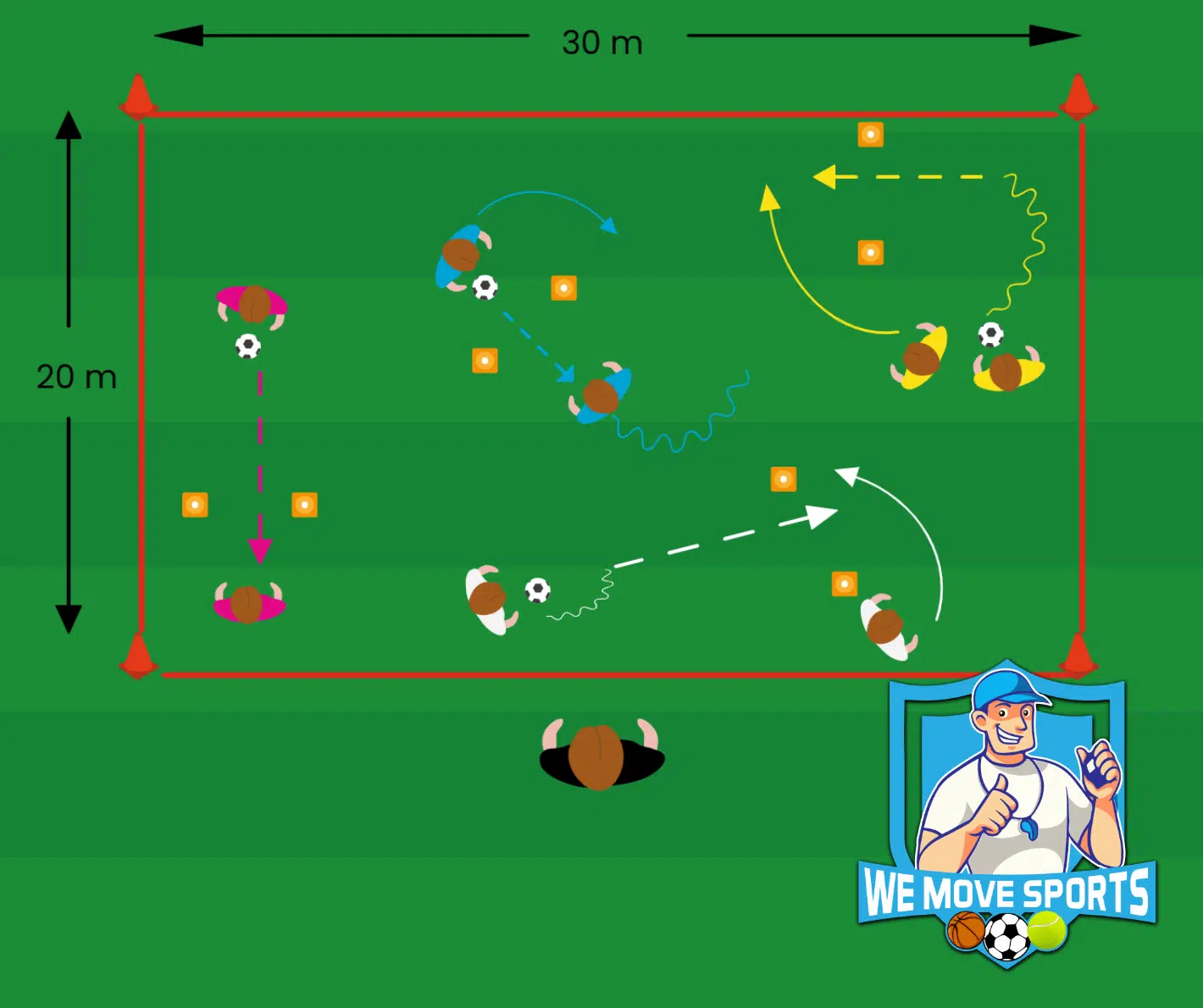 Doel: Balcontrole met kleine en lichte aanrakingen, passen, ontvangen, communiceren, hoofd omhoog om botsingen met andere tweetallen te voorkomen en te begrijpen welke poorten beschikbaar zijn.