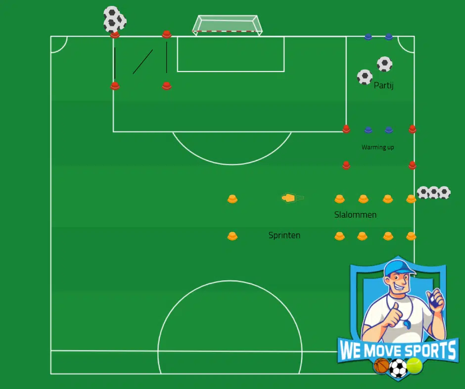 De training ziet er als volgt uit: een warming up in het rode vak met alle spelers en daarna maken we een verdeling met drie gelijke groepen. Iedere groep gaat aan de slag bij verschillende stations.Â
