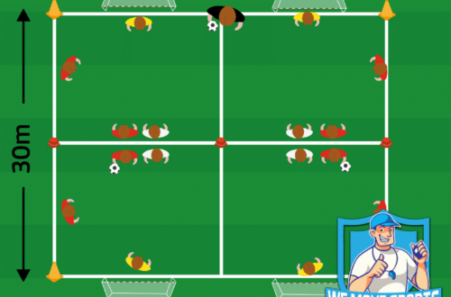 Download print PDF Legenda ? 1 tegen 1 + keeper scoren na een pass O12 4 – 12 spelers 1/4 veld Spelbeschrijving Opstarten – Afbeelding 1 Een speelveld van 30 bij 30 meter is opgedeeld in vier kleinere velden met op ieder veld 3 spelers en een keeper opgesteld. Het accent in deze warming up oefening ligt op het in…