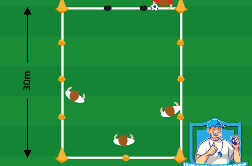 Download print PDF Legenda ⓘ Dribbelen en gericht schieten O12 9 – 12 spelers 1/4 veld Spelbeschrijving Opstarten Het veld wordt aangegeven door de 4 rode gronddoppen. Het veld is 10×10 meter. In het midden van het veld ligt een gronddop met bal erop. Per rode gronddop start er één speler. De overige spelers (aangegeven in het geel) wachten bij…